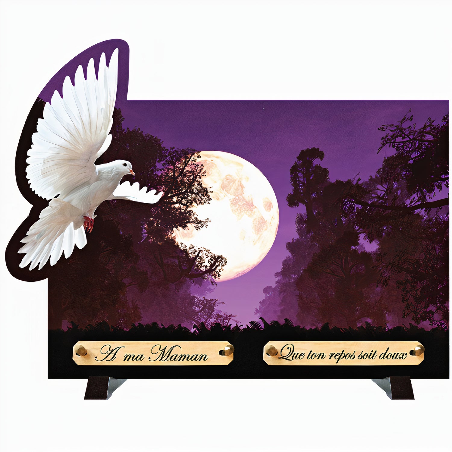 La plaque débordante Colombe est la plaque idéale pour adresser un hommage rempli de paix et de sérénité à une personne qui vous est chère. Cette plaque funéraire à la découpe originale représente une colombe blanche accompagnée d'un paysage de pleine lune.