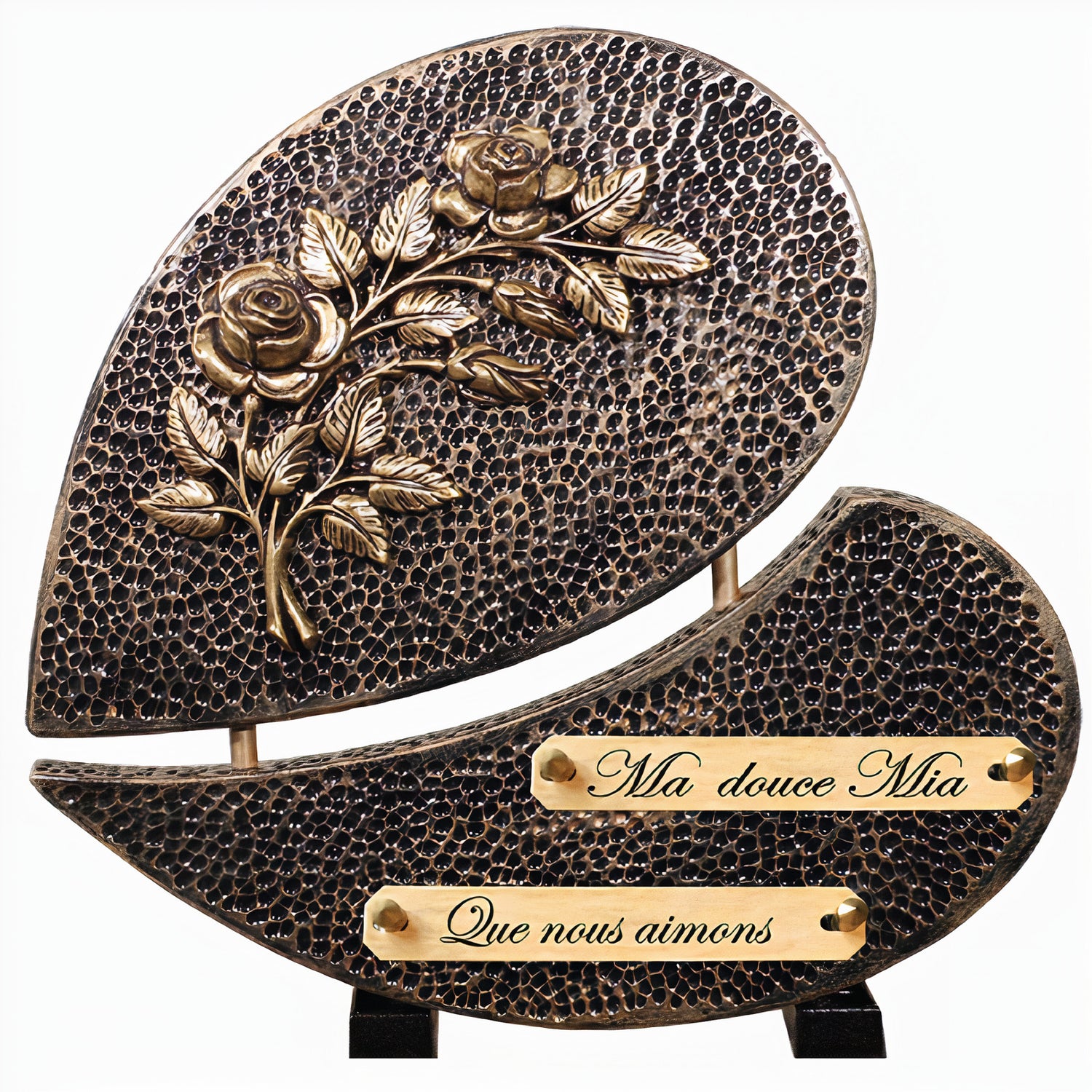 La plaque funéraire contemporaine Coeur est ornée d'un bronze funéraire représentant un bouquet de roses garni et de 2 inters personnalisés. Les roses évoquent traditionnellement l'amour, le respect et la reconnaissance. Cette plaque funéraire au design original et à la découpe en forme de coeur transmet un message d'amour fort.