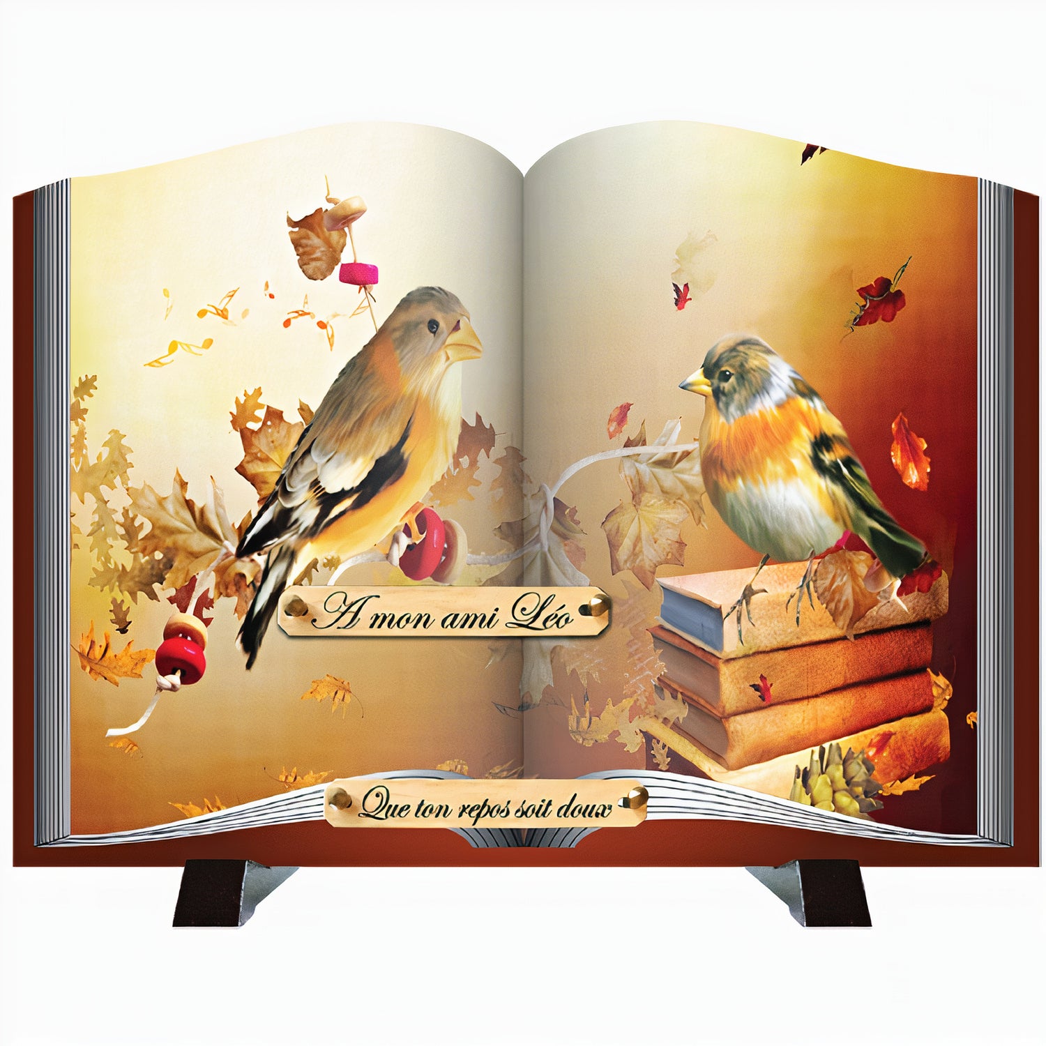 La plaque funéraire Livre Oiseau aux couleurs automnales, incarne la nature et les animaux en illsutrant deux oiseaux posés sur des livres, entourés de feuilles rouges et orange.
