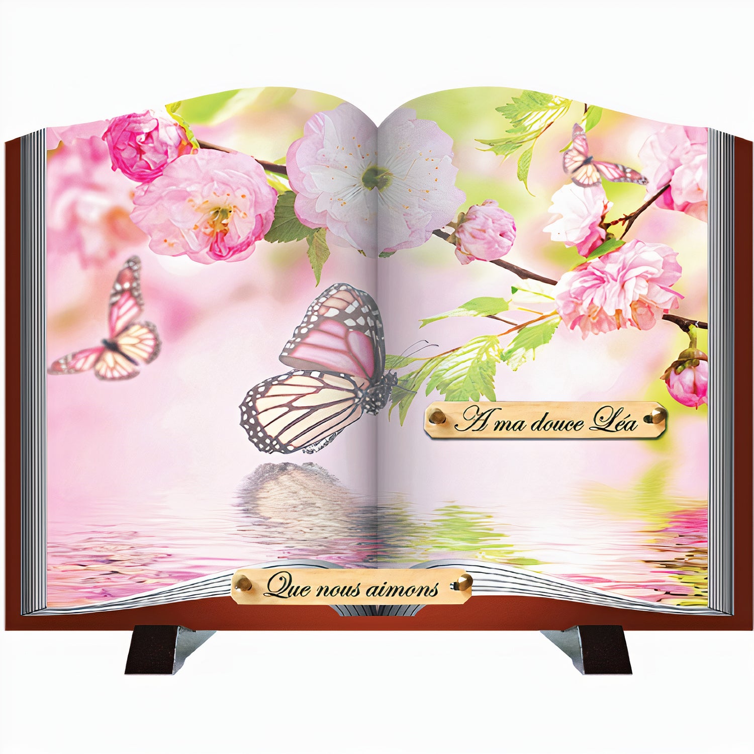 La plaque funéraire Livre Papillon sur le thème des fleurs et de la nature, représente des papillons, symboles de la renaissance et du changement, et des pivoines. Dans la culture chinoise, les pivoines sont des fleurs qui symbolisent l'amour, la générosité et la beauté féminine.