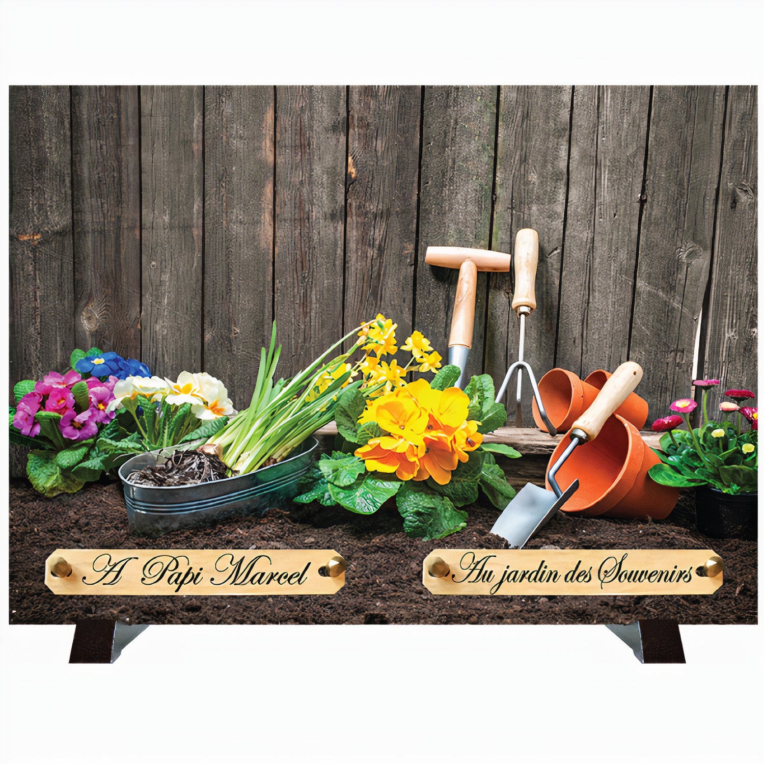 La plaque funéraire Outils de jardinage sur le thème du jardinage, de la nature et des passions, représente la panoplie complète du jardinier dans un décor de potager garni de fleurs de toutes les couleurs.