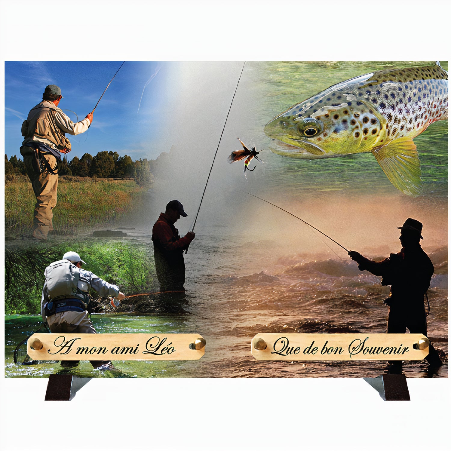 La plaque funéraire en ligne Pêcheurs & Poisson sur le thème du sport et de la pêche à été conçue pour rendre hommage à tous les passionnés de pêche et de nature. Cette plaque mortuaire représente différentes scènes de pêche à la ligne ainsi qu'un poisson pêché.