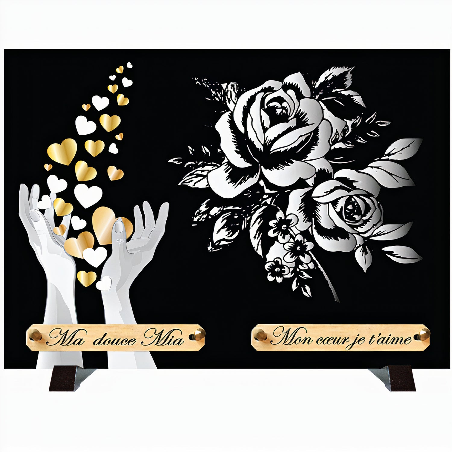 La plaque monochrome Mains & Roses sur le thème des fleurs et de l'amour, représente des mains jointes et des roses en fleurs. Cette plaque funéraire incarne l'amour et la tendresse. Les roses sont traditionnellement synonyme d'une amour fort, passionnel et profond.