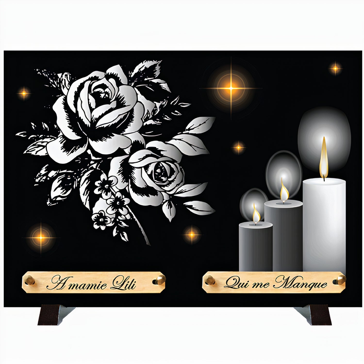 La plaque monochrome Roses & Bougies incarne le souvenir et la tendresse et représente un bouquet de roses accompagné de trois bougies allumées. Les roses sont le symbole d'un amour tendre, sincère et fort. Les bougies, souvent utilisées en guise d'offrande lors des rituels et des prières, représente le souvenir.
