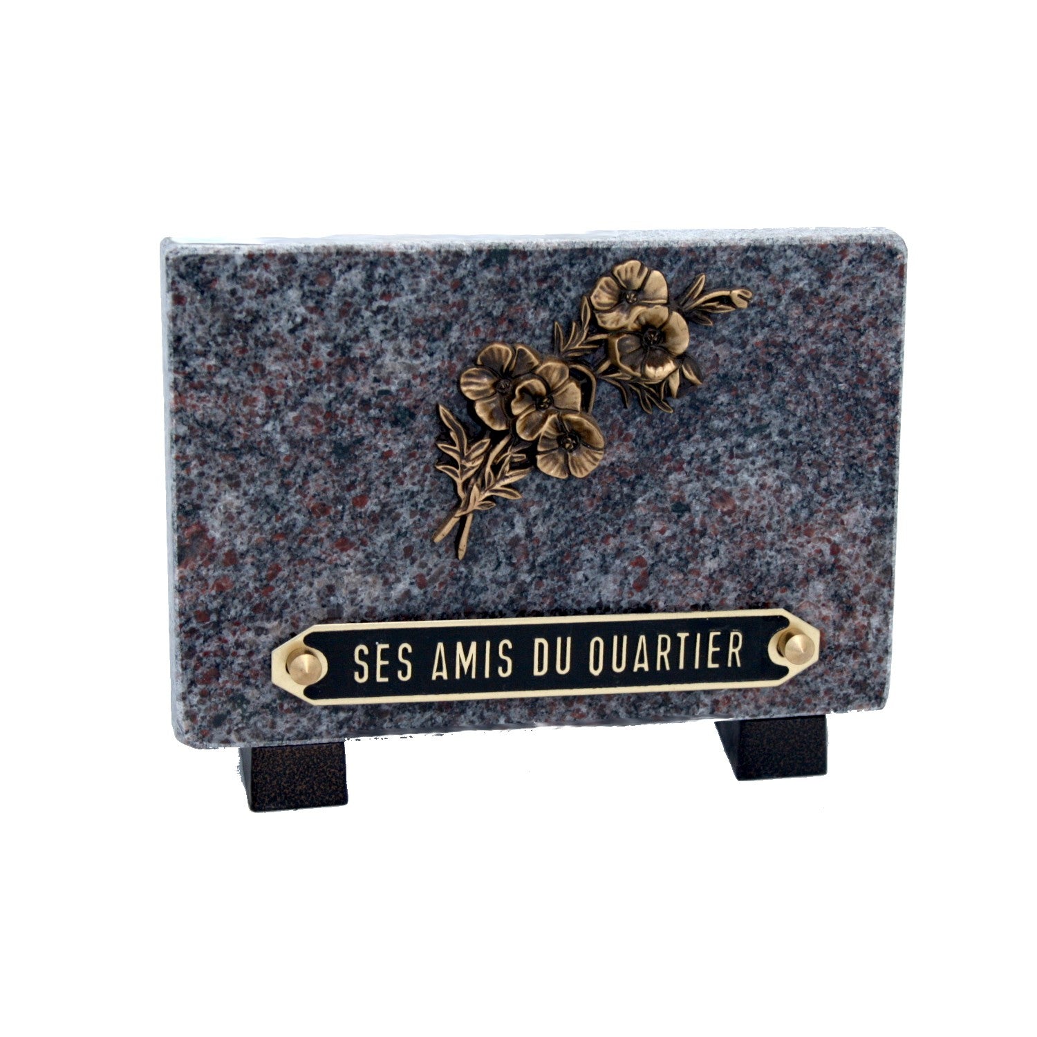 Petite plaque funéraire bon marché en granit noir à envoyer pour marquer son attachement au défunt. ATTENTION : Ce modèle n'est plus disponible qu'en granit noir contrairement à la photo. Cette plaque premier prix convient pour un enterrement ou pour perpétuer le souvenir d'un proche disparu pour la Toussaint. Le bronze actuel représente une rose à la place de la pensée. Le modèle est aussi disponible en granit rose marron veiné de noir, avec bronzes Oiseau ou maison à préciser lors de votre commande si vous le désirez à la rubrique "Commentaires de la commande" ( en bas du formulaire de commande après le panier ).