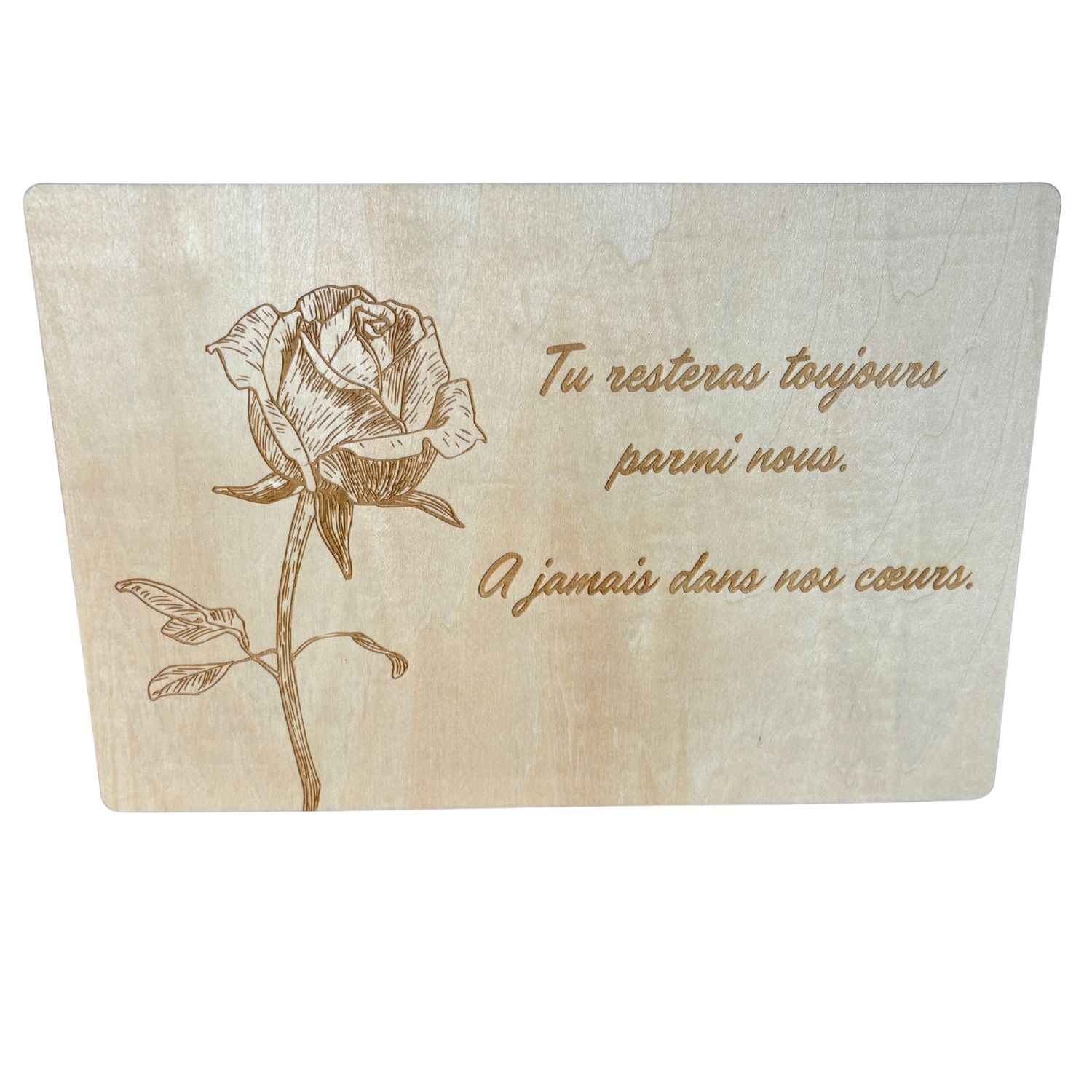 Rendez un dernier hommage unique avec notre plaque funéraire en bois, spécialement conçue pour les crémations. Disponible en deux formats (15 x 20 cm ou 20 x 30 cm), elle est décorée d’une rose gravée, symbole intemporel d’amour et de souvenir. Un texte au choix peut y être ajouté, avec la possibilité de personnaliser davantage la gravure pour un message unique.