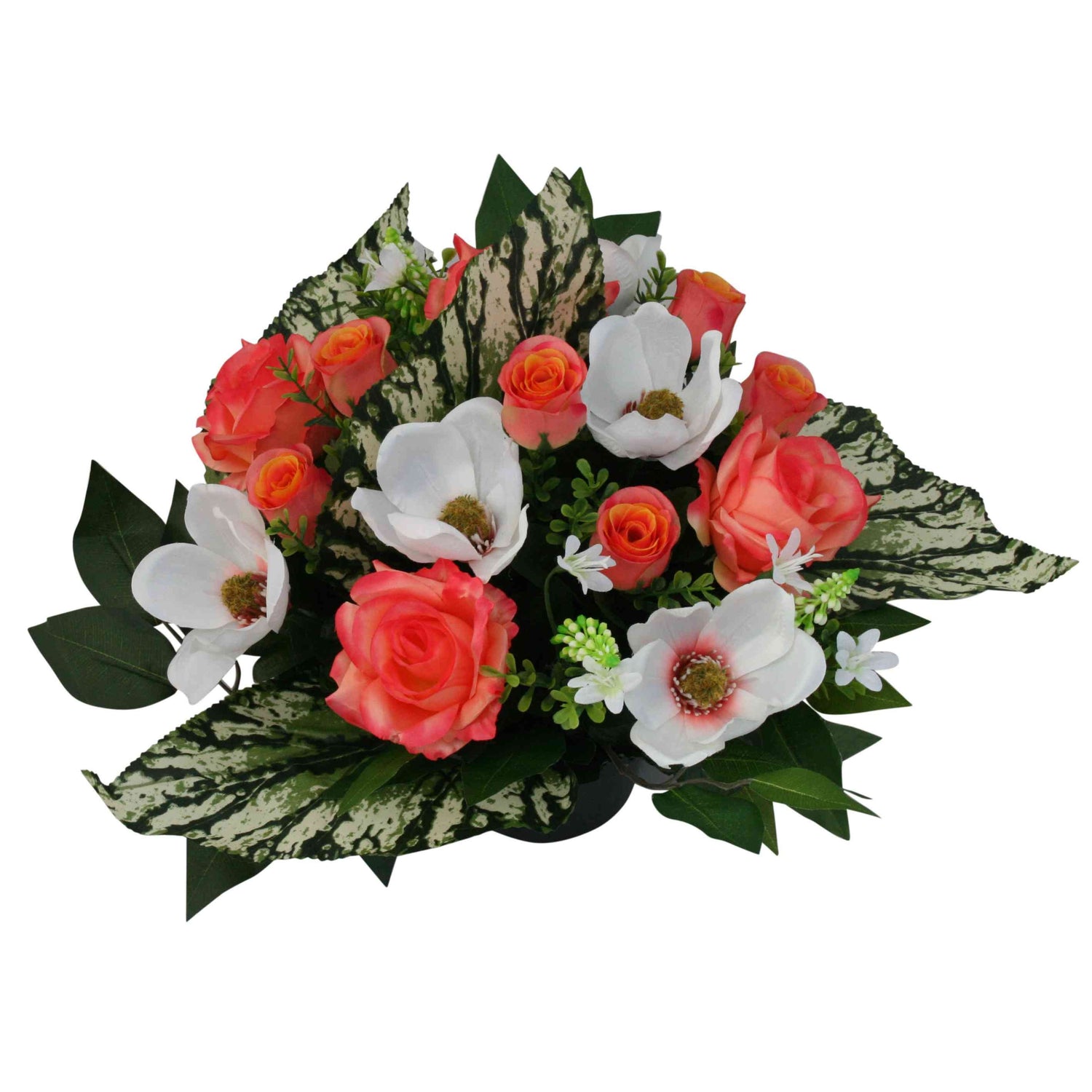 Pot de fleurs artificielles deuil pas cher. Pot de roses et magnolias artificiels. Il ne reste plus qu'un modèle en rouge et blanc. Composition à dominante de fleurs oranges et blanches dans un écrin de feuilles de diffenbachias. Les fleurs de magnolia donne de la classe au pot de fleurs artificielles deuil.