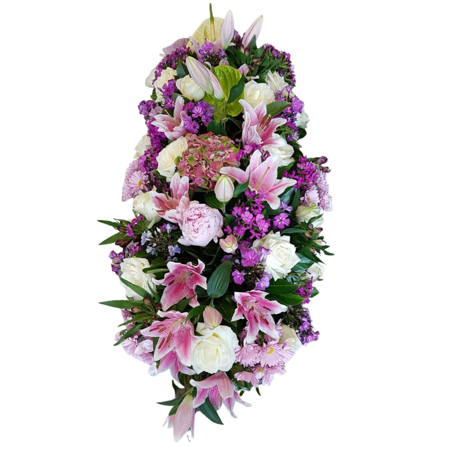 Composition florale en forme de raquette pour des funérailles. Le deuil prend ici une forme élégante avec la raquette florale, une composition imposante souvent ornée d'un ruban en option. Cette création est composée de fleurs de saisons aux tons roses, blancs et parmes. Elle est spécialement conçue pour être livrée directement sur le lieu de la cérémonie en hommage à la personne disparue.